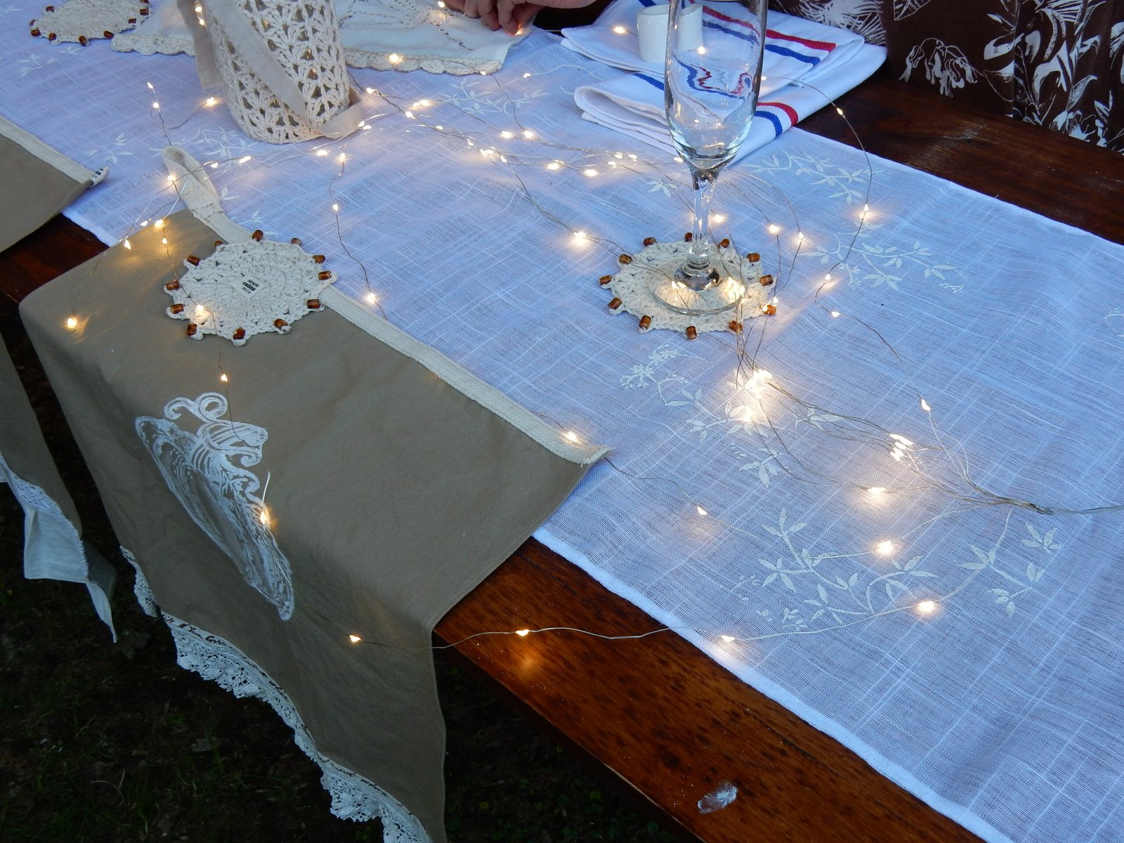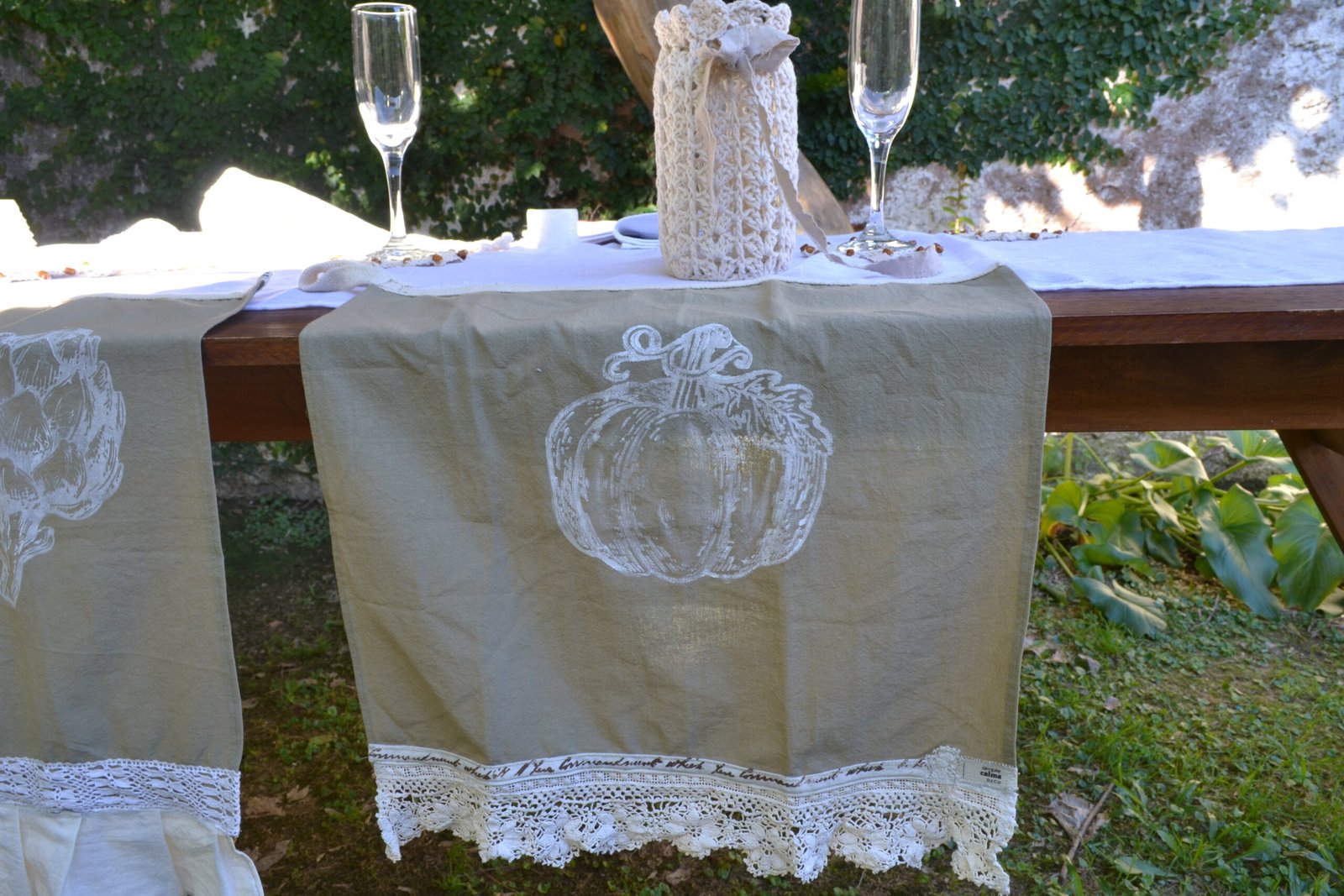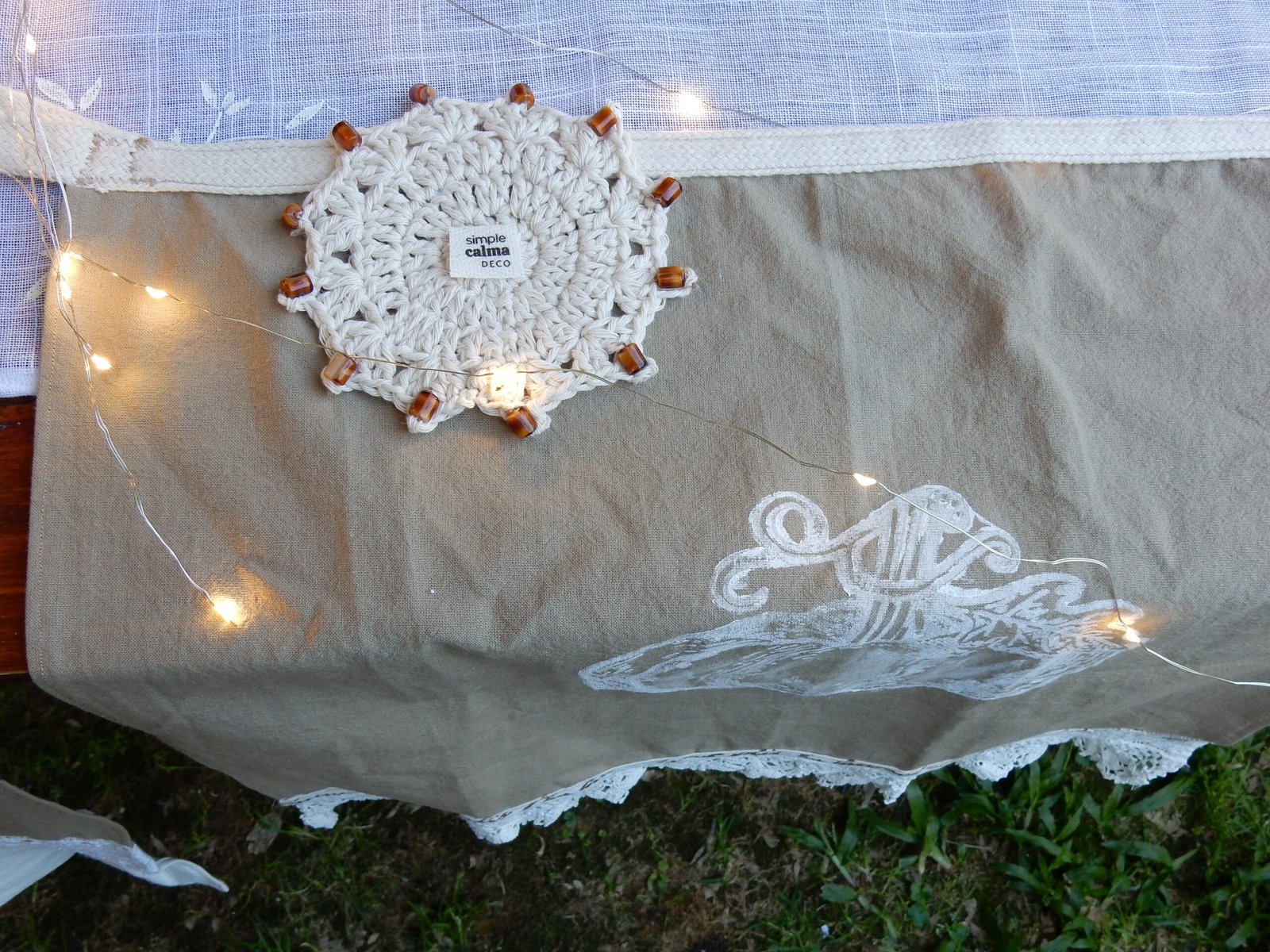 Repasador colgante de uso diario color verde oliva con serigrafía en blanco con puntilla antigua